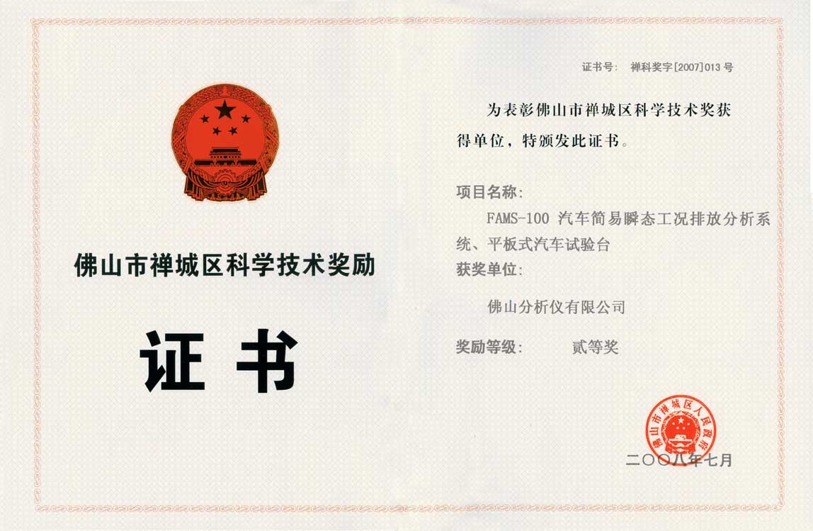 佛山分析儀有限公司的“FAMS-100汽車簡易瞬態(tài)工況排放分析系統(tǒng)、平板式汽車試驗臺”項目榮獲佛山市禪城區(qū)科學(xué)技術(shù)獎二等獎